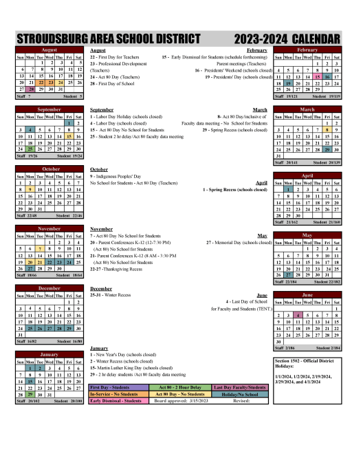 Stroudsburg School Calendar 2025 Calendar Stroudsburg Area School District: OKLAHOMA CITY (KOKH) โ Oklahoma City Public Schools (OKCPS) has released its calendars for the 2025-2025 and 2025-2026 school years. The calendars include breaks and intersessions, professional . The high school wrestling season starts Friday and continues through mid-March, culminating with the PIAA Wrestling Championships at Hersheyโs Giant Center. Here is the composite schedule for the 38 .